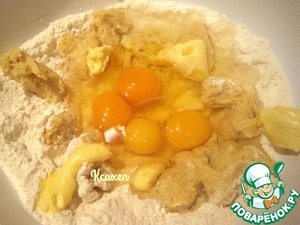 Для дрожжевого теста: в большой посуде смешаем муку, соль, сухие дрожжи и сахар. По оригинальному рецепту сахара нужно 180 грамм. Я положила 130-ть грамм. Добавим опару, нарезанную на кусочки, мягкое масло. В мучной смеси сделаем лунку, вольём разболтанные куриные яйца и тёплую воду.