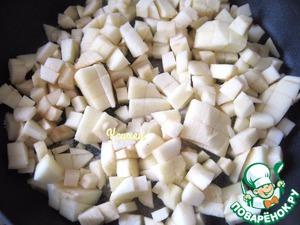 Для начинки: очищенные от кожуры яблоки нарежем на кубики. В сковороде растопим сливочное масло и обжарим яблоки с добавлением сахара и корицы, до мягкости и пока не выпарится вся жидкость. Дадим начинке остыть.