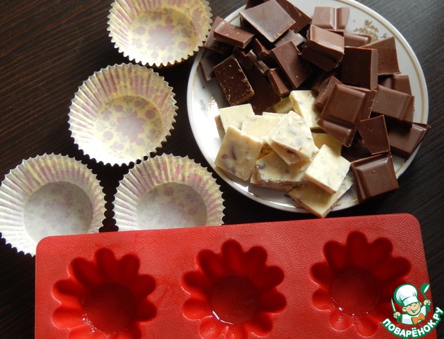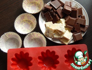 Шоколад ломаем на дольки, у меня три вида, молочный, белый с орехами и кофе с молоком. Булочки будут пасхальными подарками поэтому я решила выпекать их в бумажных формочках.