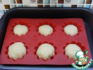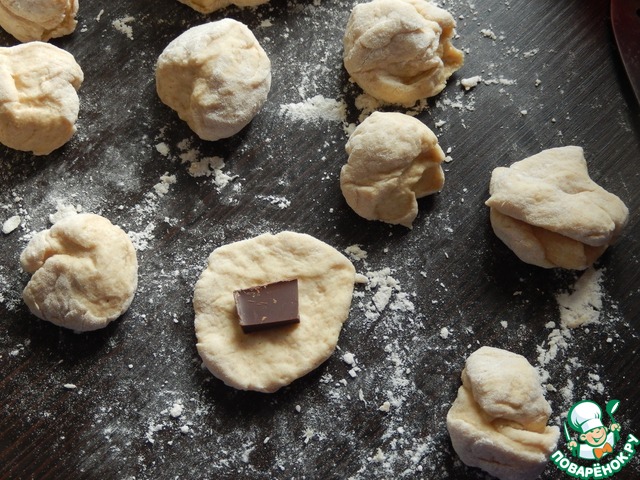 Тесто делим на небольшие шарики взависимости от размера желаемых булочек. Уменя получилось 24 шт. каждый кусочет разминаем руками в центр кладем кусочек шоколада защипываем края и выкладываем в формы швом в низ.