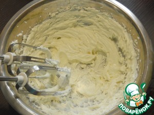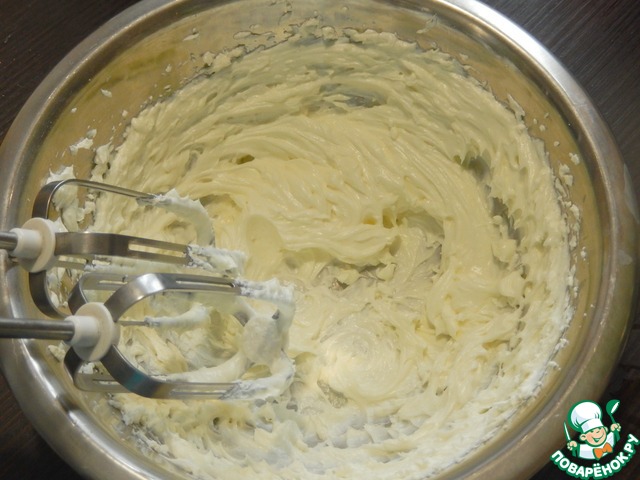 Приготовим крем, взобьем нашу сметанную массу потихоньку добавляя сахарную пудру. По ходу пробуя на сладость.