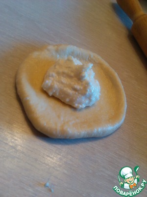 Разделать на кусочки как для пирожков. Раскатать, положить в центр 1 десертную ложку начинки -