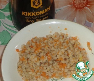 На сковороде разогреваем растительное масло, поджариваем на нем репчатый лук, добавляем морковь. Затем добавляем мясной фарш и соевый соус Kikkoman. Перчим массу по вкусу. Тушим около 15 минут под закрытой крышкой, постоянно помешиваем. Если мясо не жирное, то подливаем воду, чтобы оно не прилипало к сковороде.
