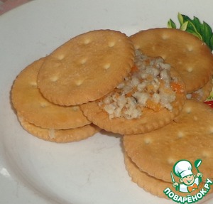На один крекер кладем мясную начинку и накрываем другим крекером.