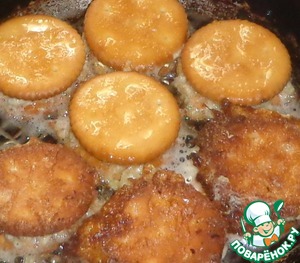 Яйцо взболтать вилкой, посолить немного. Обмакнуть крекер с мясом в яйцо и обжарить на растительном масле до румяного цвета.
