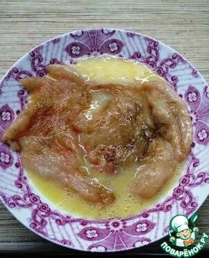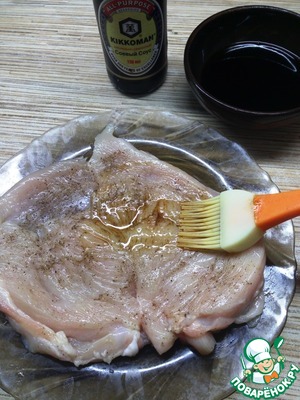 Куриную грудку помыть, обсушить. Филе отделить от кожи и костей, разрезать вдоль на 2 части. Получится 4 пласта. Каждый пласт отбить через пакет ручкой ножа или гладкой стороной молоточка для мяса. Отбивать без фанатизма, чтобы грудка была мягкая и чуть увеличилась в размере. Каждую отбивную натереть перцем (по вкусу) и смазать соевым соусом. Я когда использую соевый соус, особенно ТМ "Kikkoman", я не солю дополнительно, а вы смотрите по своему вкусу, при необходимости подсолите. Поставить отбивные в холодильник на полчаса мариноваться.