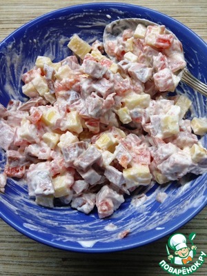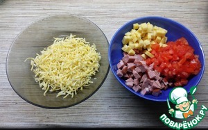 Тем временем подготовить начинку. Ветчину нарежем небольшими кубиками (можно использовать подкопченную колбаску, если кто любит),100 гр сыра нарезать такими же кубиками. Из помидоров удалить мякоть и нарезать. Оставшиеся 50 гр сыра натереть на мелкой терке.