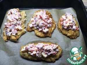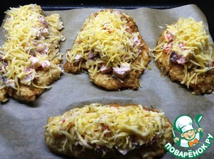 • Начинку выкладываем на отбивные, распределяя равномерно между отбивными. Близко к краю не кладите, лучше горочкой по середине.