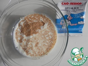Теплое молоко смешать с сухими дрожжами САФ-ЛЕВЮР и 0.5 кг муки. Подождать чтоб опара подошла (увеличилась в 2 раза)