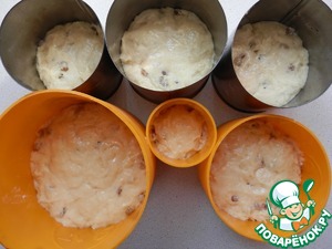 Раскладываем тесто в смазанные маслом формочки и даем еще раз подойти. Ставим в разогретый до 180° духовой шкаф и выпекаем 30-40 мин. Если сверху тесто быстро румянится, то накрываем пергаментом.