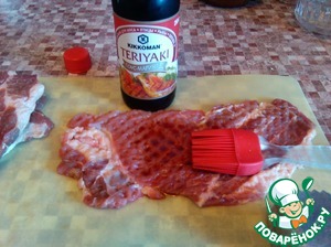 Мясо отбиваем и кисточкой смазываем соусом-маринадом Терияки "Киккоман". Складываем в контейнер и убираем в холодильник мариноваться на час-другой