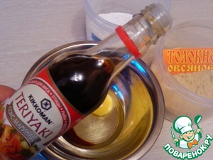 Смешиваем яйцо, 1 ч. л. соуса Терияки "Киккоман", крахмал и толокно в однородную массу. Она получается гуще, чем обычный кляр -