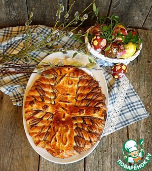 Полоски, которые остались посередине пирога украшаем цветами из обрезков теста и буквами ХВ и крестом.