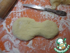 Для формирования снопа, отделим кусок теста, раскатаем в форме овала и сформируем ему талию, на которой изобразим впоследствии импровизированную веревку.