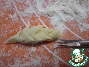 Для формирования стебелька скатываем длинные тоненькие полосочки. Колосок делаем из кусочка теста, который скатываем толстенькой колбаской и маникюрными ножничками, делаем надрезы по всему кусочку теста.