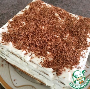 Потереть шоколад и посыпать сверху. Дать пропитаться 2-3 часа (у меня он обычно ночь стоит в холодильнике).
