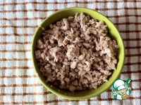 Затем снова два блинчика. На них мясную начинку, два блинчика. Грибную начинку и оставшиеся два блинчика. Получается такое подобие кирпичика.