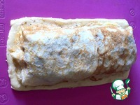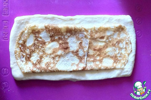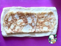 Подошедшее второй раз тесто ещё раз обминаем. Из одной части раскатываем прямоугольный пласт, толщиной около 1 см. На него выкладываем два блинчика.