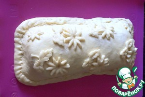 Накрываем оставшимся тестом и украшаем. В тесто для украшения нужно добавить немного муки, чтобы оно было круче и лучше держало форму.