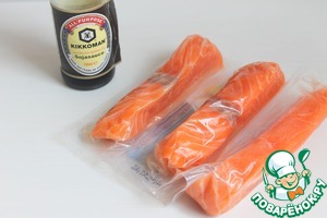 Размoрозим рыбу, зальем ее соевым соусом. Оставим на полчаса.