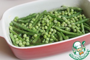 Для зеленой подушки нам нужна будет фасоль стручковая и зеленый горох. У меня все замороженное. Я просто сразу все смешала и сложила в форму небольшую. Можно, конечно, и раньше достать и разморозить, или взять свежую.