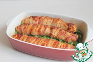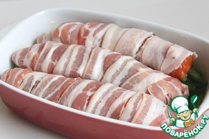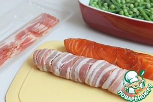 Когда рыба замаринуется, берем ее и завернем каждый кусочек в бекон. Он у меня очень тонко нарезанный.