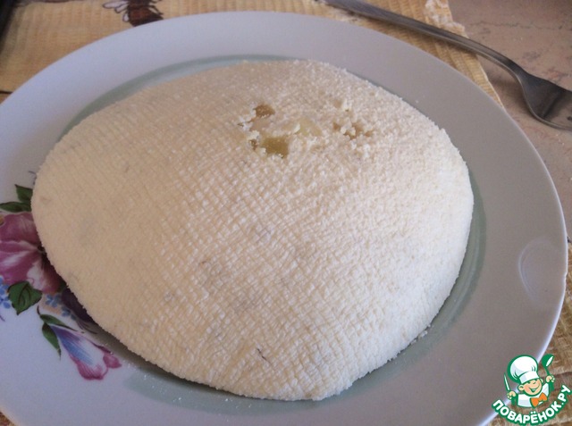 Выкладываете в форму выстеленную марлей (плошку, специальную пасечницу, горшок с дыркой или дуршлаг), переворачиваете, закрываете сверху краями марли. Сверху ставиться пресс, например банка с водой и в холодильник. Это нужно для придания формы и удалению лишней жидкости.