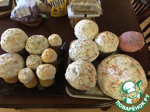 С порции получилось 18 куличиков. Готовые куличи смазываем меренгой ( взбиваем белки, затем вводим сахарную пудру до перламутрового цвета)