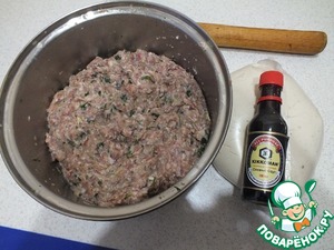 • Готовим фарш: обрезаем нутрию от кости и перемалываем, также куриное филе, добавляем лук, чеснок, соль, соевый соус, зелень и оставляем мариноваться на 1-2 часа.