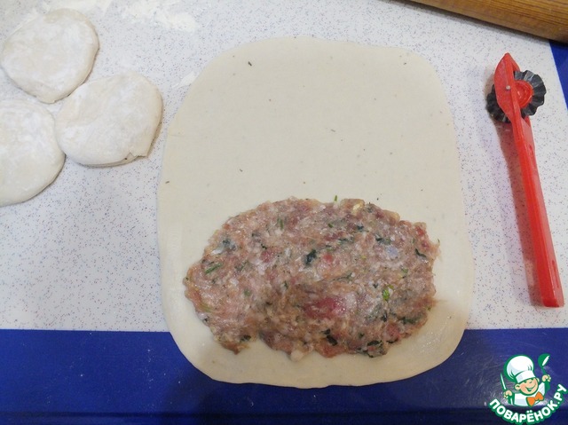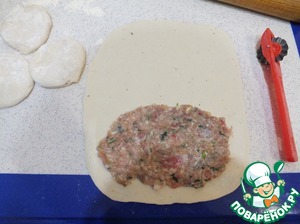 • Из теста формируем шарики по 70-80 г, раскатываем в тонкие пласты. На один край выкладываем начинку и закрываем.