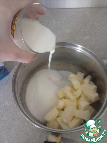 В небольшую кастрюльку кладем разрезанное на кусочки масло, сахар и молоко.