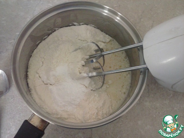 Теперь добавляем муку и разрыхлитель. Взбиваем так, что бы не было комочков.