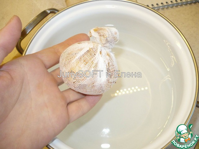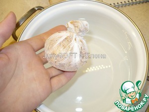 • СОВЕТ: Т. к. яйца я закручивала одна, то мешочек было трудновато завязать нитками, чтобы марля не разваливалась во время завязывания, я сначала затянула края марли резинкой, а уже поверх нее спокойно завязала узел нитками.