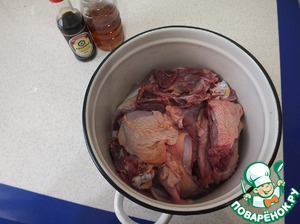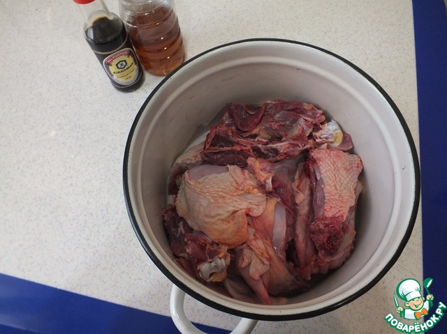 Порезать мясо на куски, замариновать в специях, соевом соусе и уксусе. Я оставляла мясо на ночь в маринаде, так как мясо петуха немного жестковато.