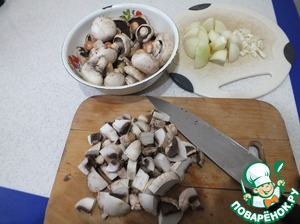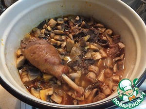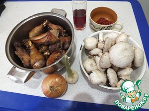 Мясо, вино, бульон и томатную пасту складываем в кастрюлю и 30 минут тушим. Затем добавляем грибы, лук, чеснок и тушим еще 15 минут