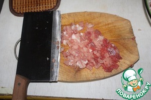 Мясо порезать мелким кубиком и порубить топориком или тяжелым ножом