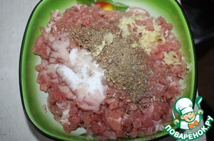 Добавить соль, посеченые ножом семена фенжеля и аниса, перец, давленный чеснок. Хорошо перемешать и оставить на 1 час. В это время подготовить оболочку.