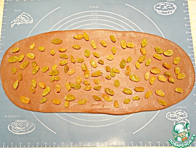 Коричневое тесто раскатываю толщиной примерно 3-4 мм длиной больше примерно на 15 см длины прямоугольной формы для выпечки (у меня форма 11*30 см). Выкладываю изюм (я использовала крупный), изюм прижимаю к тесту и плотно, выпуская воздух, сворачиваю тесто в рулет по длинной стороне.