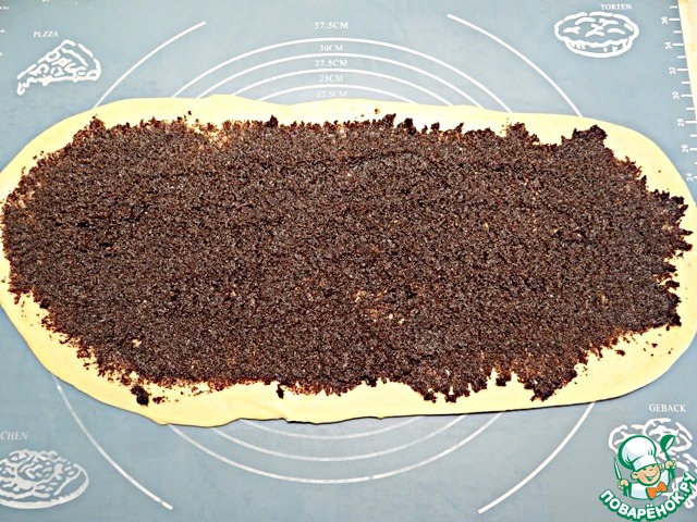 Белое тесто делю на 2 равные части, одну часть раскатываю так же, как и коричневое тесто, распределяю по тесту готовую маковую начинку, чуть отступая от краев. Тесто плотно сворачиваю в рулет.