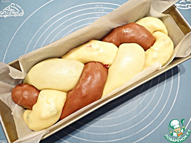 Тесто накрываю пленкой и даю ему увеличиться в объеме примерно в 2 раза. Смазываю верх плетенки взбитым яйцом.