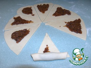 Раскатать тесто не толсто и порезать на 8 частей в виде треугольников. Положить по чайной ложке начинки, чуть размазать и свернуть в трубочку.