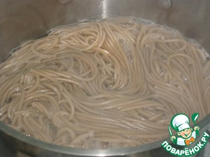 Отварить лапшу в кипящей подсоленной воде до готовности.