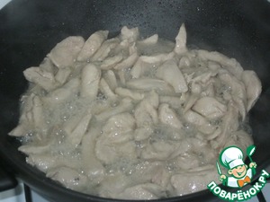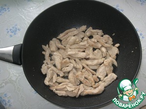 Куриное мясо нарезать длинными кусочками и обжаривать в сковороде с маслом на сильном огне.