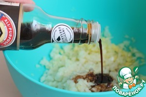 Добавим теперь соевый соус к измельченной массе. Далее посолим, добавим любые ваши любимые специи, у меня для мяса. И еще нужен был соус чили. У меня был просто томатный соус.