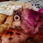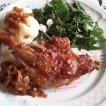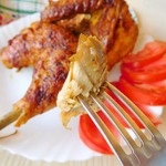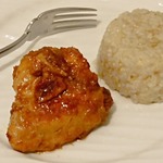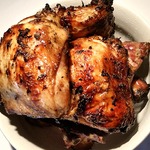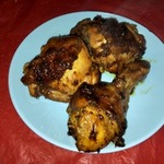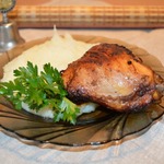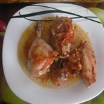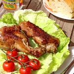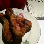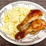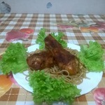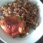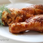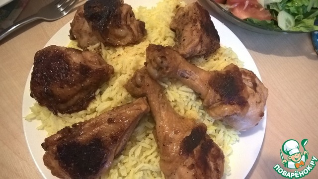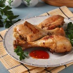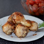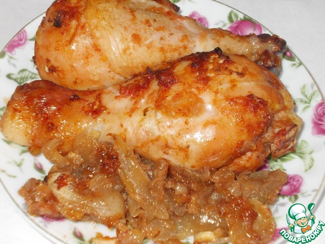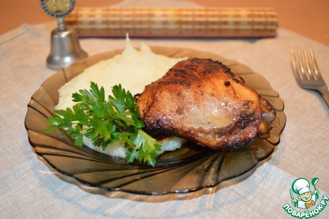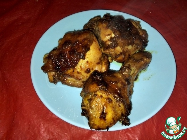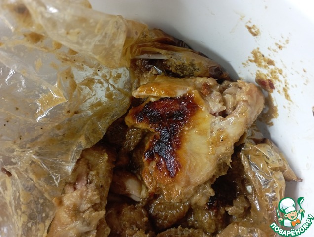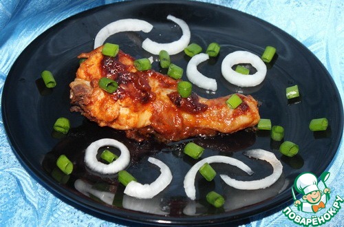 Кстати, имбирь у меня оказался только молотый, ни чили, ни томатного соуса не было вообще. Смешала мелко нарезанный лук, чеснок, молотый имбирь, соевый соус, соль и перец. Курочка мариновалась около 2-3 часов. А затем я обваляла еще ее в оливковом масле и поставила запекаться в духовку, выложив свесь лука-чеснока и приправ на голень сверху.