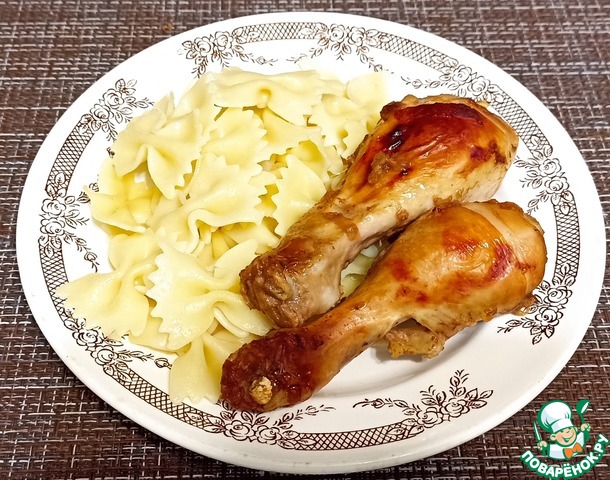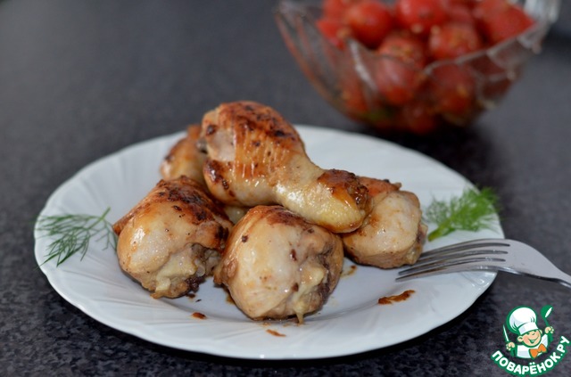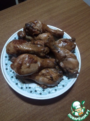 Кладем теперь куриные голени, перемешиваем и оставляем на час минимум. Можно такое мясо мариновать заранее.
