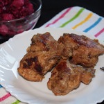 Через час достаем мясо, можно слегка очистить от кашицы, кладем на разогретую сковородку с маслом и обжариваем. Сначала я жарила с двух сторон на сильном огне. Затем огонь убавила, долила немного воды и тушила под крышкой еще минут 10. Затем открываем крышку и дожариваем еще минут 5-7, Периодически мясо переворачиваем. Mожно проверить готовность, надрезаем и смотрим мясо. Если мясо белое, то готово. Жидкость испарится, и мясо приобретет красивый вид.