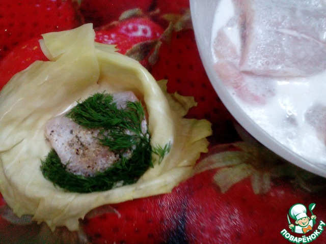 • Капустные листья бланшируем кому как удобно, я в микроволновке. Достаем рыбу из сливок (сливки оставим для соуса), в капустный лист заворачиваем филе рыбы, веточку укропа, присыпаем солью и душистым перцем.