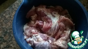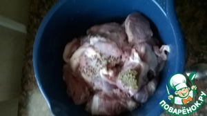 Замочить мясо, добавив аджику, кинзу, соль по вкусу