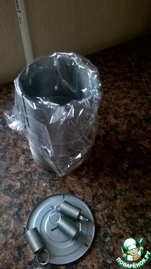 Пакет завязать, ветчинницу собрать, поместить в в кастрюльку с водой и варить 90 минут.